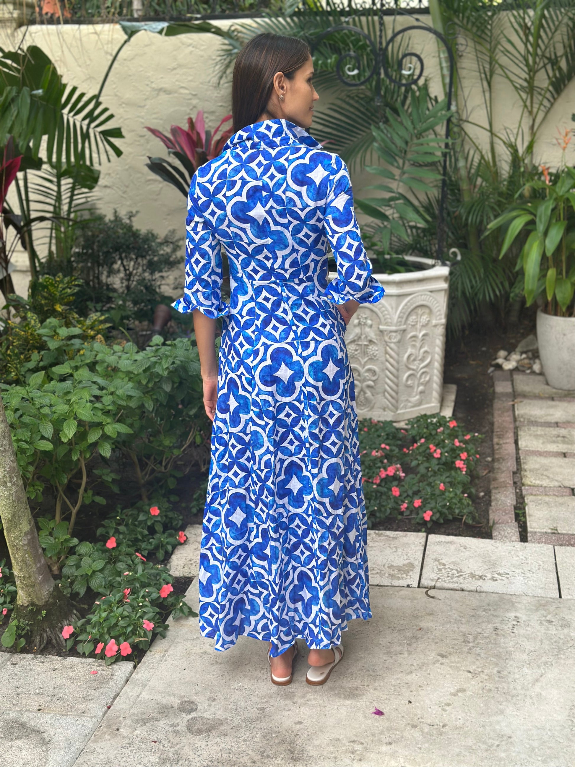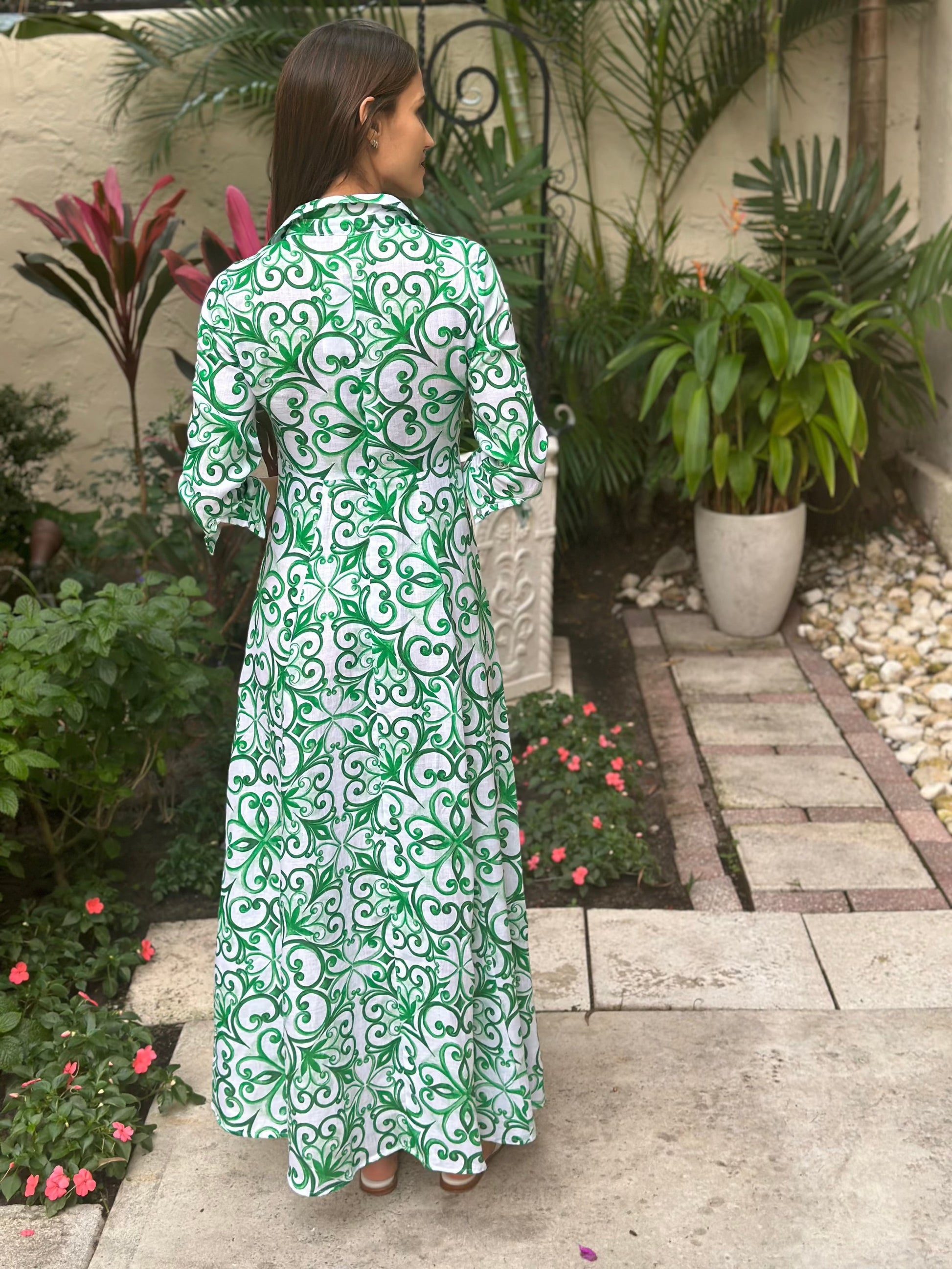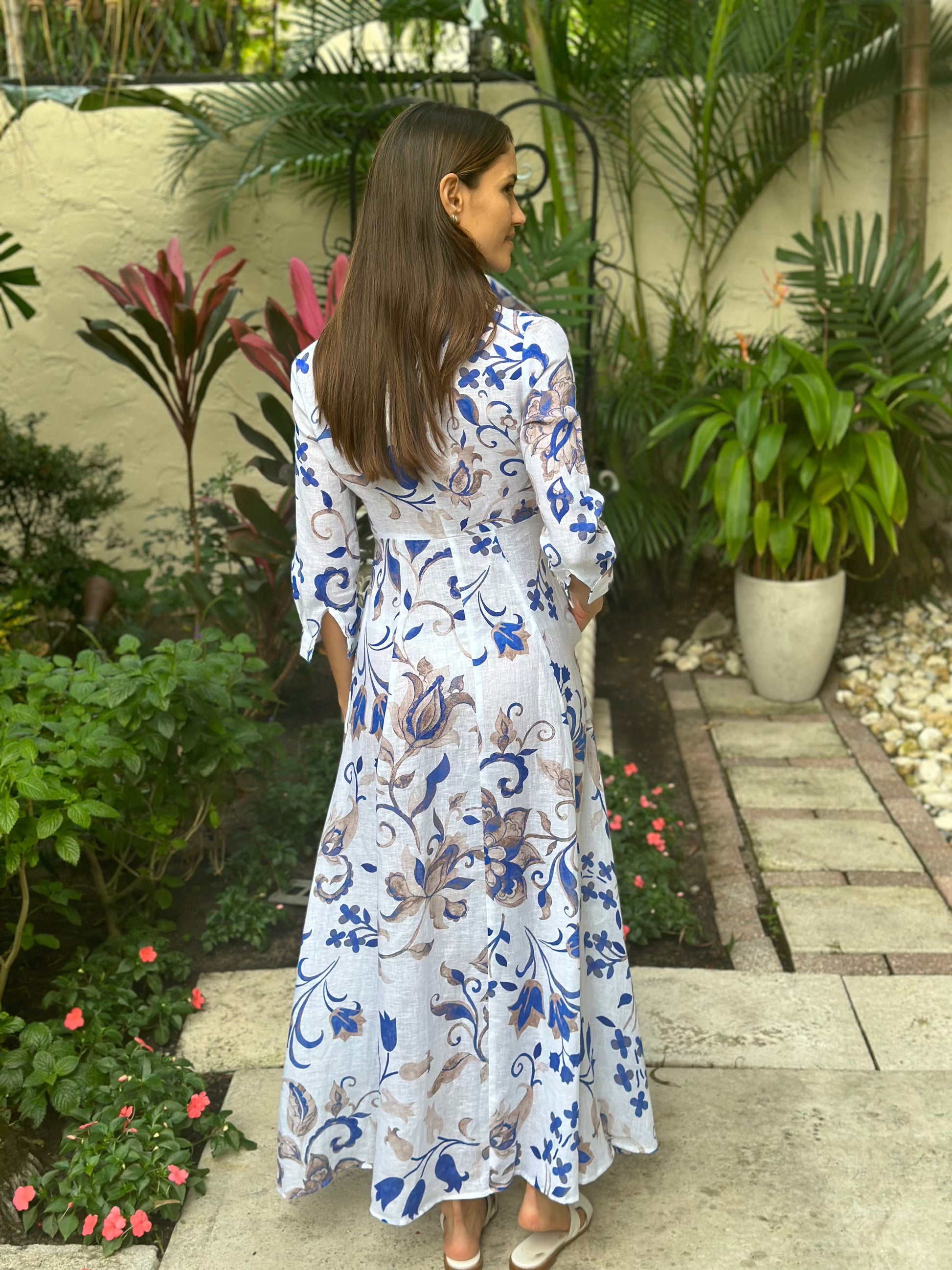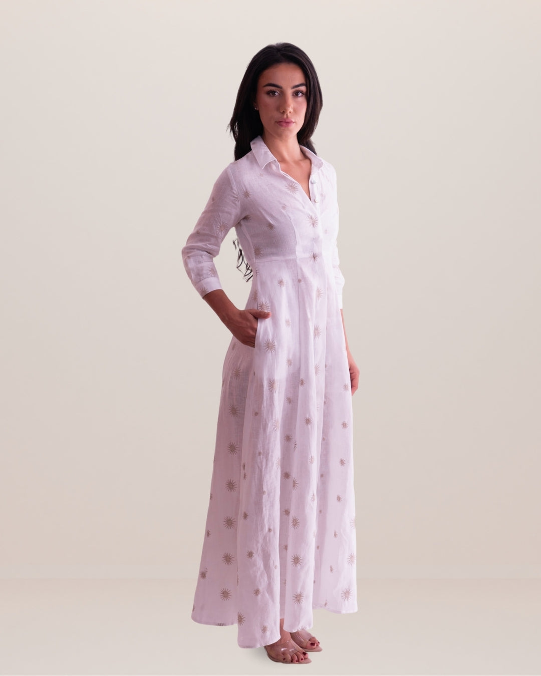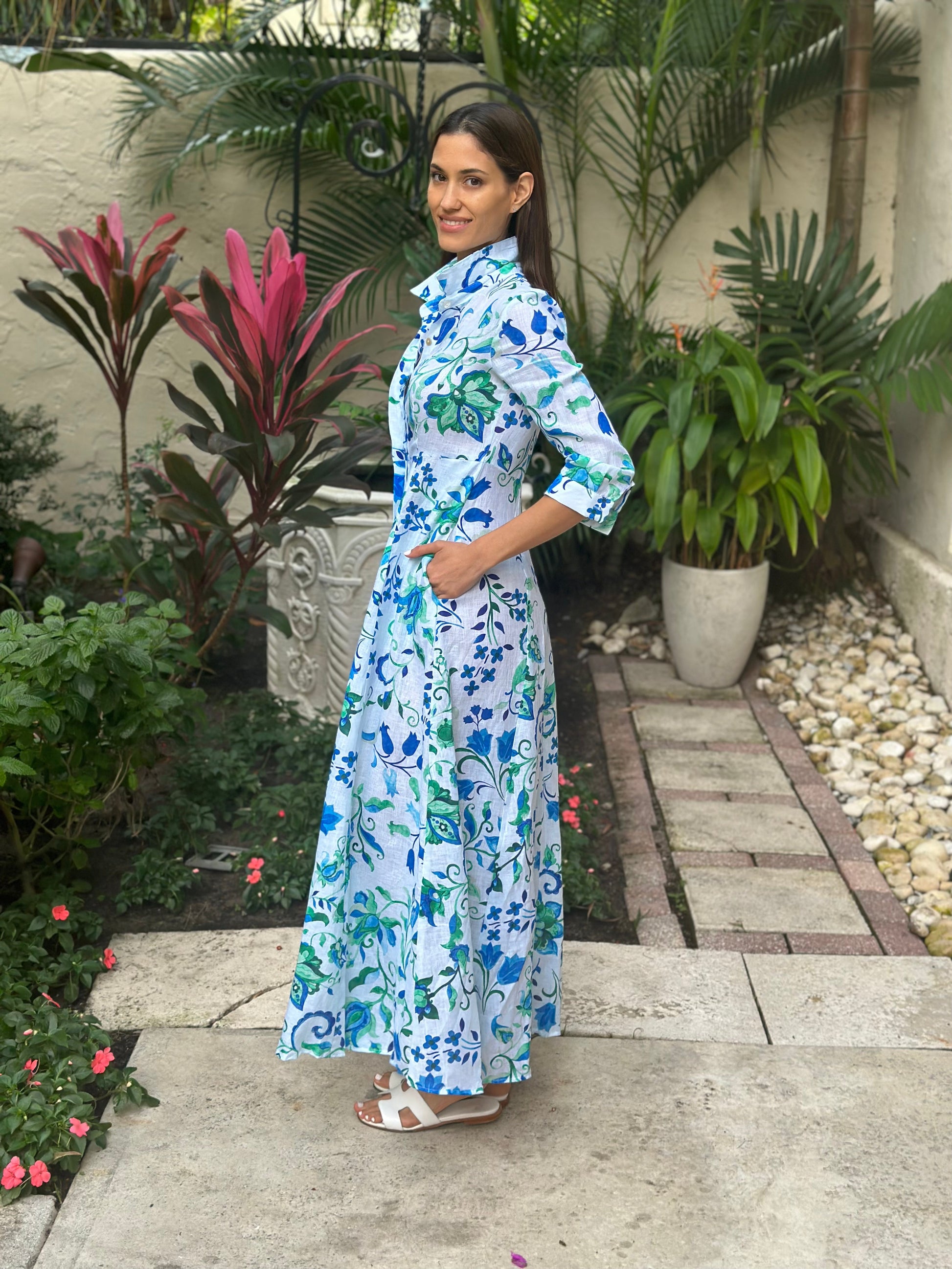 Our shirt dress has everything you ever wanted in a full- length, button-up dress. A long, lean, and lovely silhouette that will elongate your torso. Enjoy the versatility of this dress by wearing it as a dress or open as a duster. Wear it casually by rolling up the sleeves or dress it up with one of our leather rope belts for a perfect resort chic look.