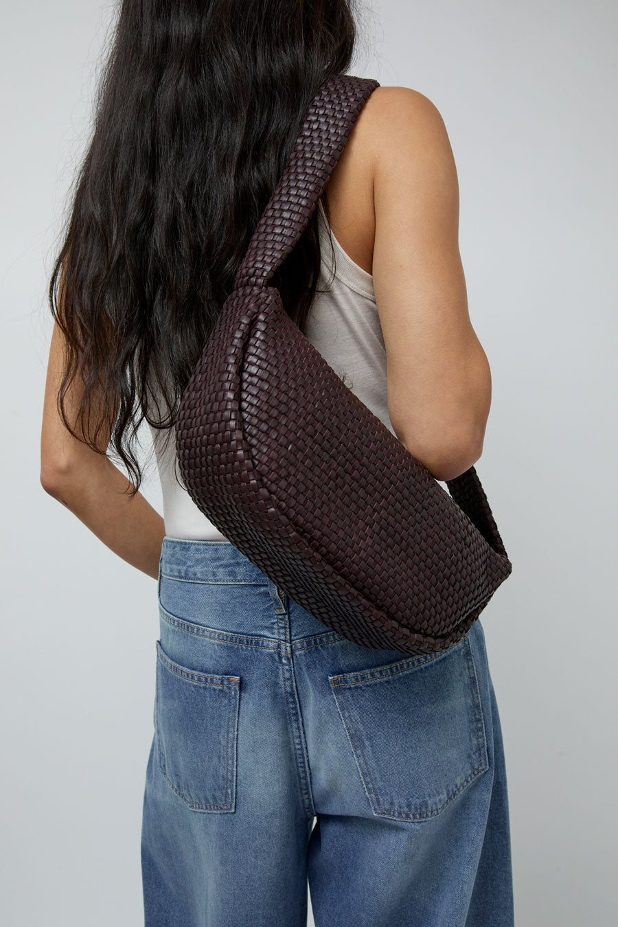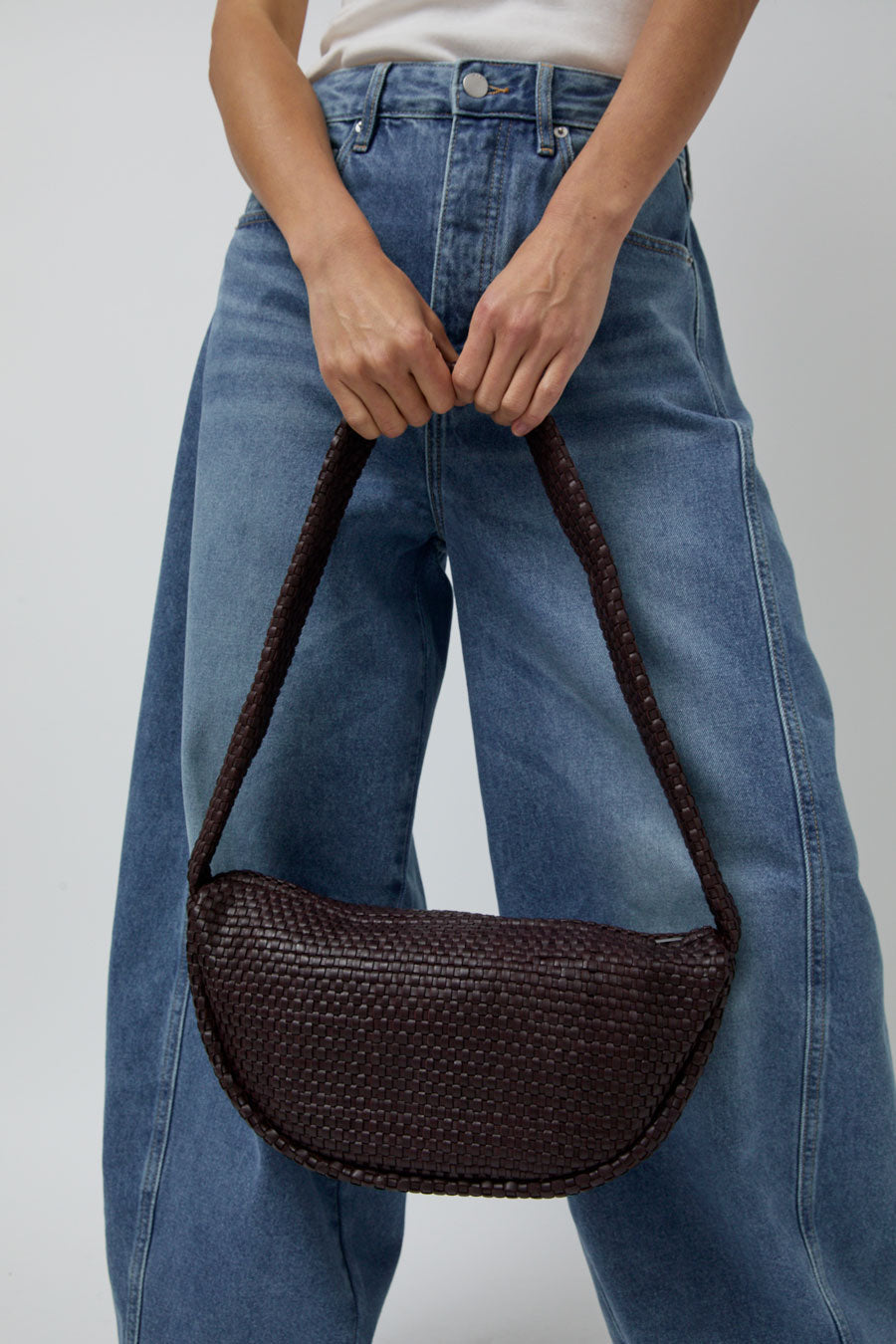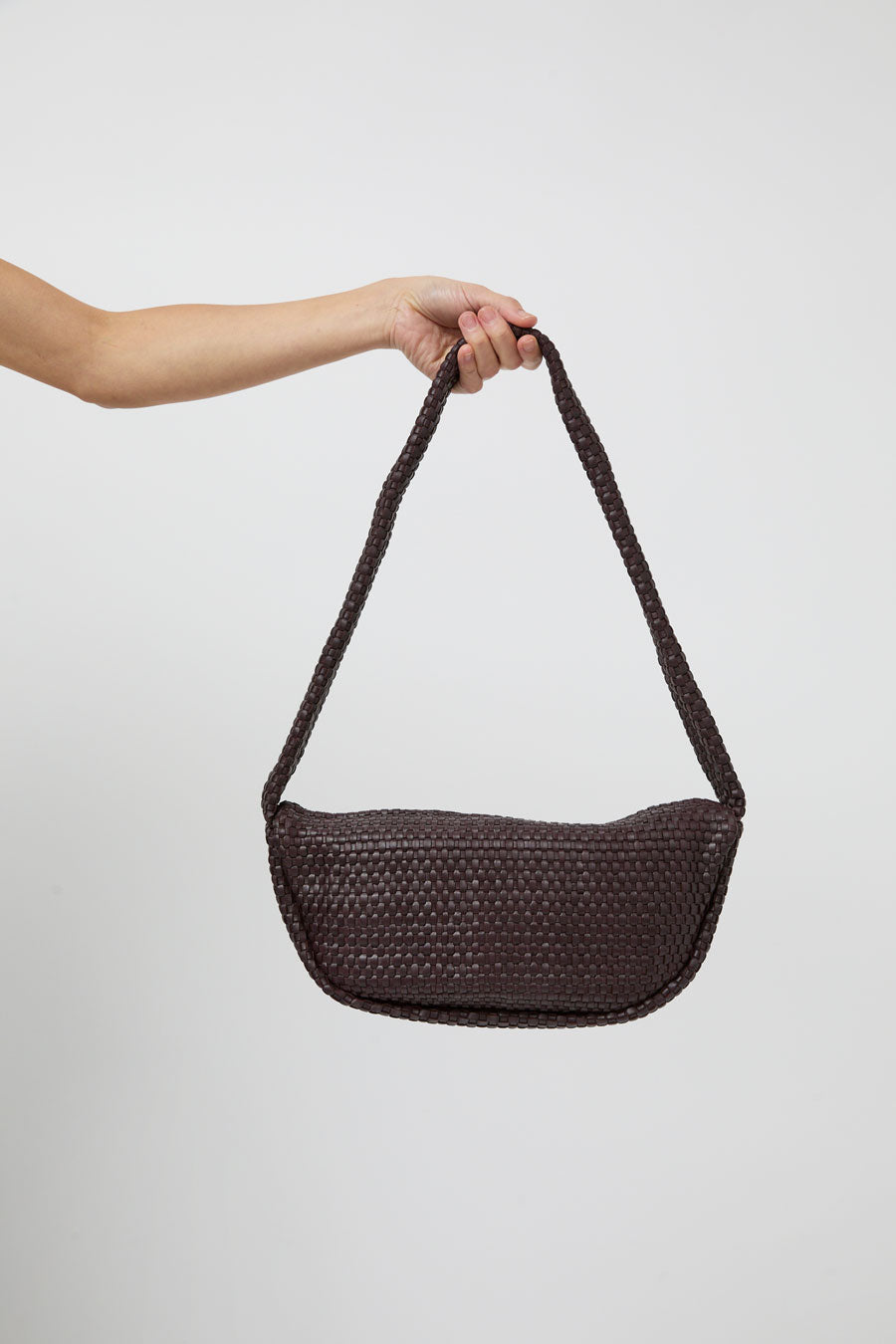 Crescent-shaped bag in woven leather. Features lattice weave body and shoulder strap. Suede lined. Custom St. Agni zipper closure.