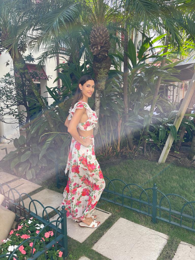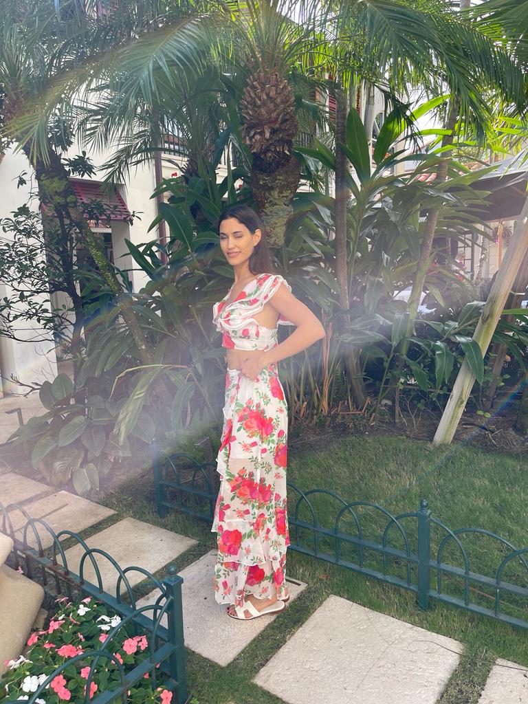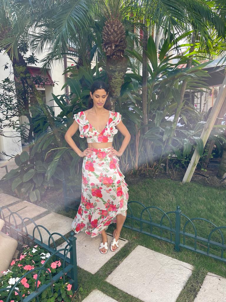 With its neckline and sleeves decorated with ruffles, the Julie crop top is a romantic piece. Discover it matched with the Kelly skirt.