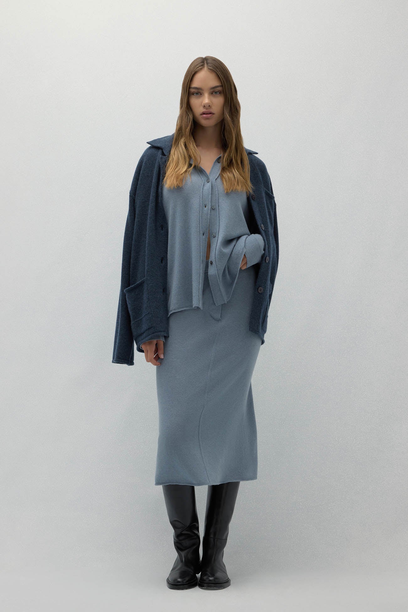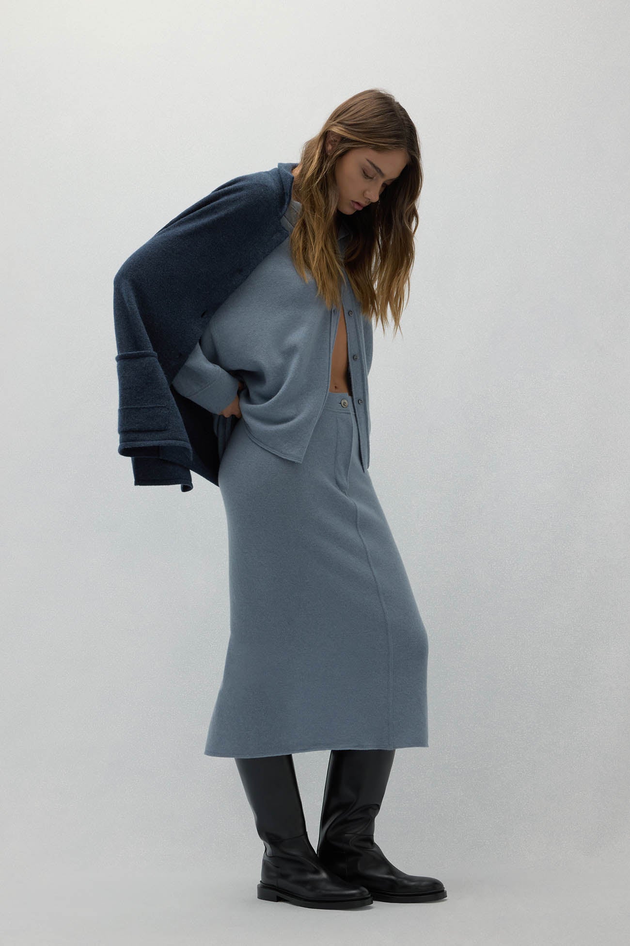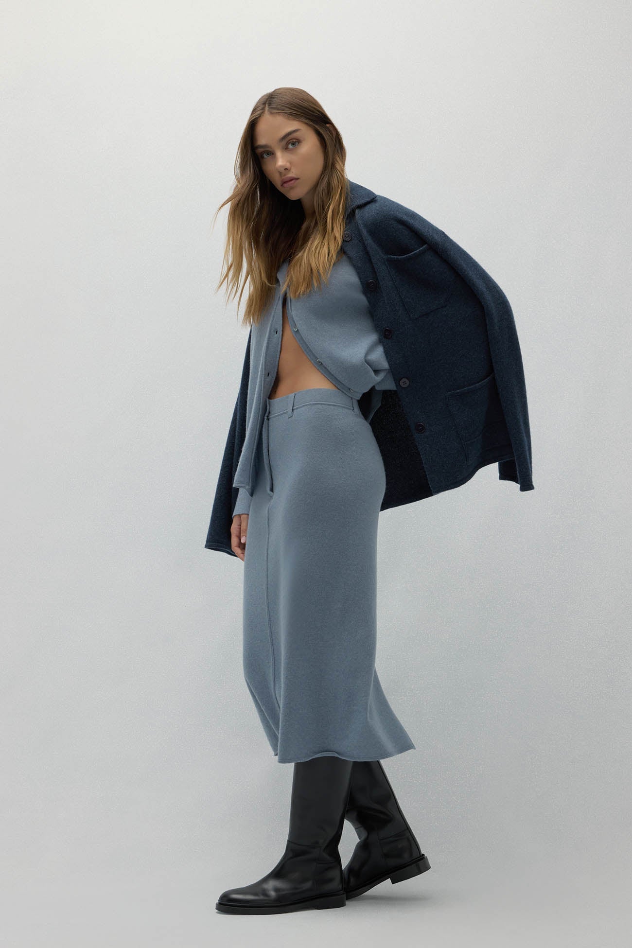 A wardrobe classic redefined—the denim midi skirt, transformed in fine Italian cashmere. Made in Italy with artisanal craftsmanship, it delivers casual attitude with a touch of indulgent luxury.