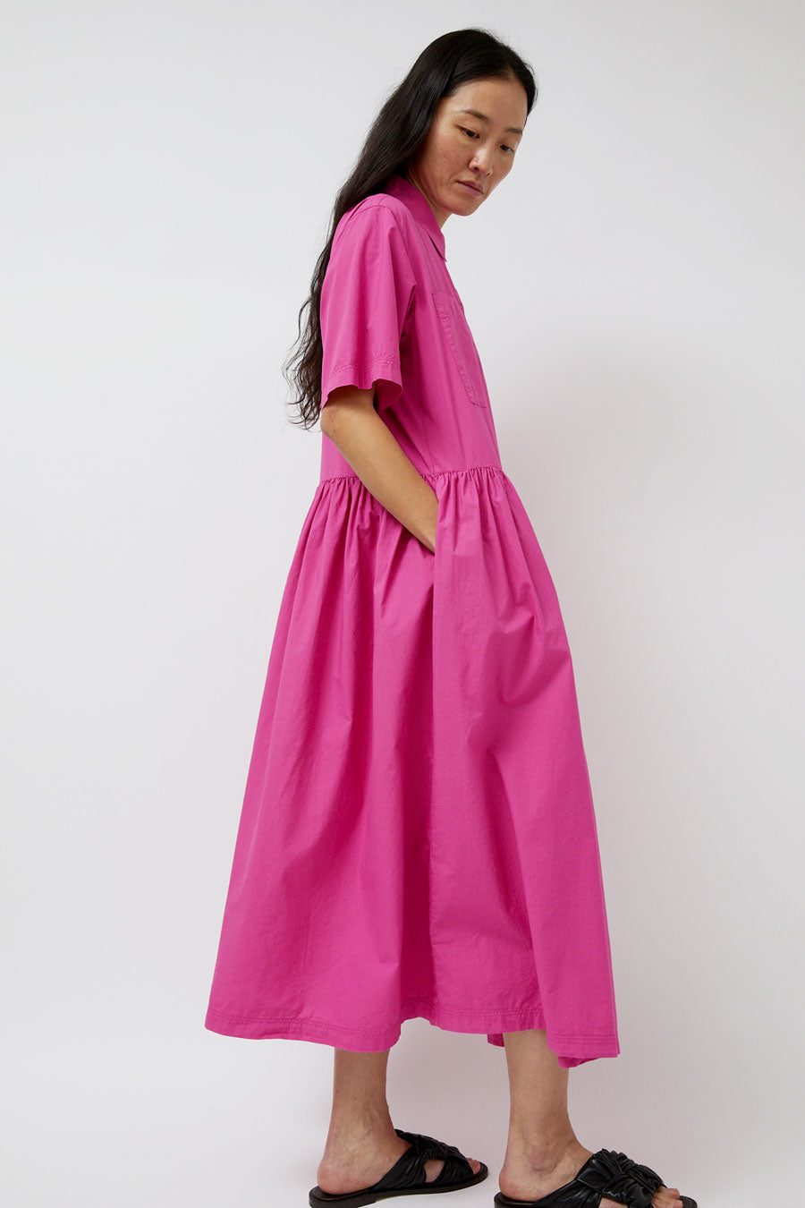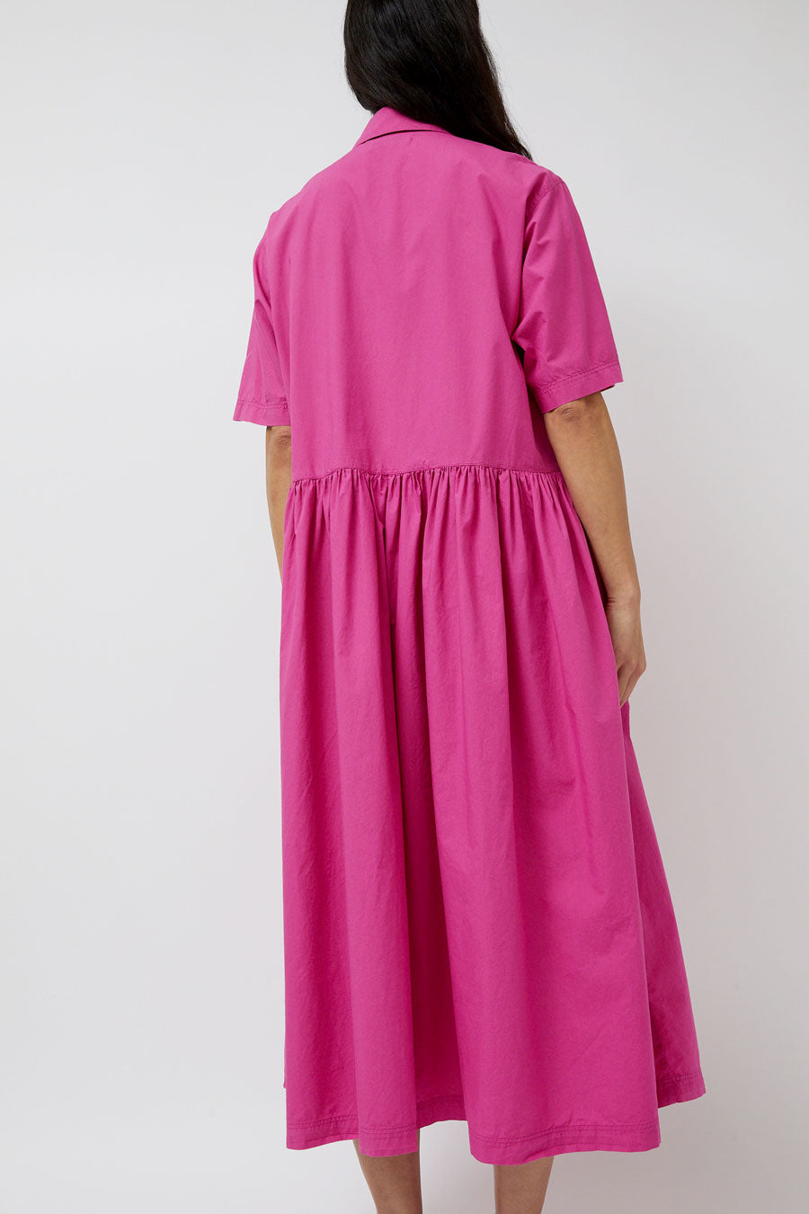 Oversized short-sleeved midi shirt dress cut in a lightweight cotton poplin. Garment dyed and enzyme washed in a punchy pink. Features chest patch pocket and corozo button closure.